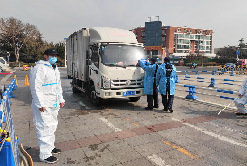 安保人员在北门给出入校园的保障车辆、人员进行登记、消毒