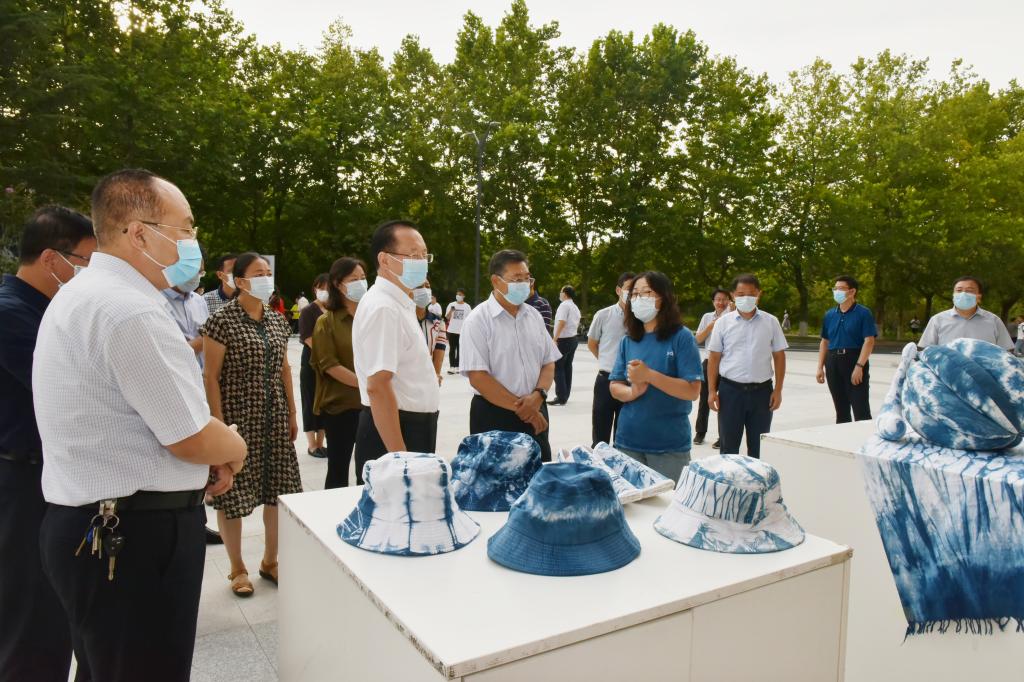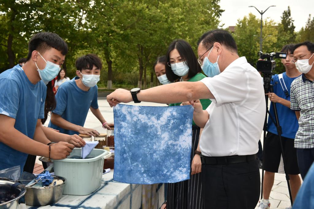 “即使使用同一道具,同样扎法,为什么最后呈现出的是不同的效果呢?”罗公利、尹华参观了现场摆放的各种蓝染作品,并亲自体验了蓝染方巾制作。整个过程中,罗公利饶有兴趣地不时询问,了解蓝染的制作原理。他对本次体验活动表示充分肯定,勉励艺术学院发挥专业特色,不断丰富校园文化,传承中华非物质文化遗产,为提升学校美育教育以及学校文化品牌宣传建设贡献自己的力量。