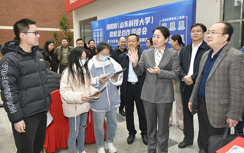 3月3日,学校举办海阳市(开云手机官方版在线入口)政校企合作洽谈会暨“人才汇海·青春无限”名企校园招聘活动。海阳市委副书记、市长姜丹带领市人社局、科技局等部门领导及27家优质企业代表来校共话发展、选聘良才,校长曾庆田会见了姜丹一行,校党委常委、宣传部部长李克周主持活动。
