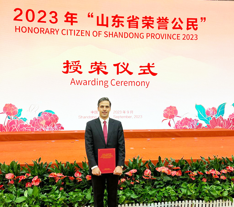 9月28日下午,2023年“山东省荣誉公民”授荣仪式在济南举行,省委书记林武,省委副书记、省长周乃翔出席仪式,纳赛尔受邀参加授荣仪式。仪式上,林武为纳赛尔颁发荣誉证书。授荣仪式结束后,纳赛尔受邀参加了省政府国庆招待会,并向省领导汇报了我校在中伊教育、科技、文化以及人才培养方面所作出的卓越贡献,受到省领导肯定和赞赏。