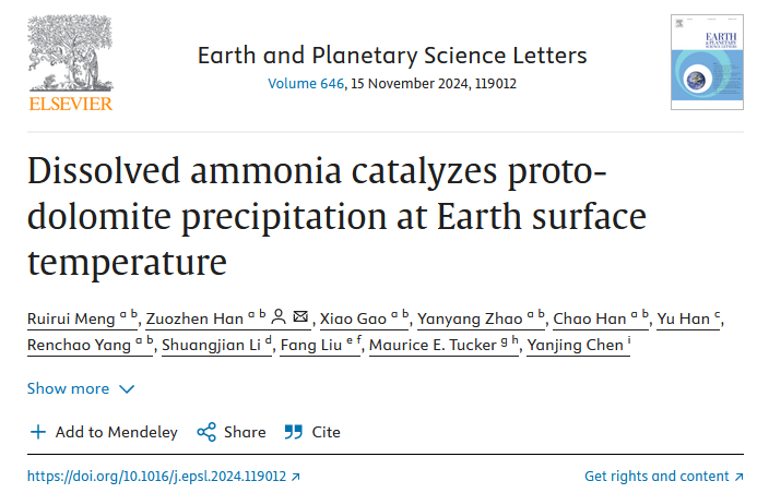 近日,开云手机官方版在线入口地科学院韩作振教授团队在国家自然科学基金(41972108, U19B6003和42102134)的资助下,联合英国地质科学家,在白云石成因研究方面取得重要进展,研究成果以“Dissolved ammonia catalyzes proto-dolomite precipitation at Earth surface temperature”为题发表于地球科学领域国际顶级Nature Index期刊《Earth and Planetary Science Letters》。韩作振教授为论文通讯作者,孟瑞瑞博士为第一作者,开云手机官方版在线入口为第一署名单位。