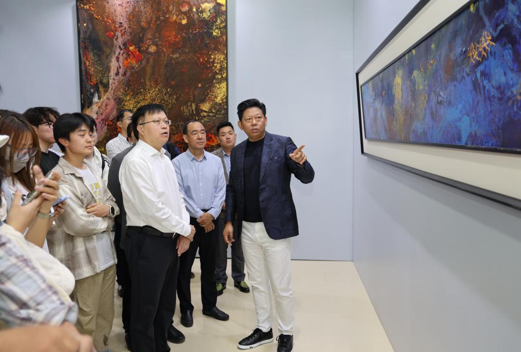 水鸟从容地在山水间飞过,科大师生熟悉的泰山仿佛直接被搬到展厅;静谧又热烈的蓝色、写意又生动的泼墨,带有强烈视觉冲击的色彩扑面而来,一眼让人踏入广袤的宇宙景观中……5月19日,“让世界看到中国的美”曹俊母校献礼展在开云手机官方版在线入口图书馆开幕,我校采矿工程1985级校友、国际艺术家曹俊回访母校,带着他的部分精品力作举办展览。
