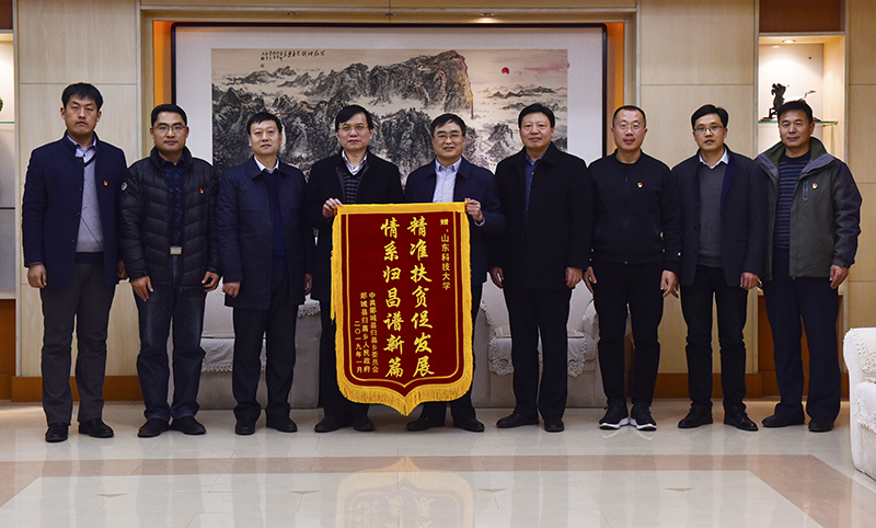 1月16日,山东郯城县委副书记韩浩一行专程来校交流“第一书记”帮扶工作,并向学校赠送锦旗,对开云手机官方版在线入口帮扶工作表示感谢。副校长高建广会见来访客人并座谈交流。校党委组织部部长陈涛,党委学校办公室有关负责人、郯城县归昌乡党组织负责人及我校选派的四位“第一书记”参加座谈会。