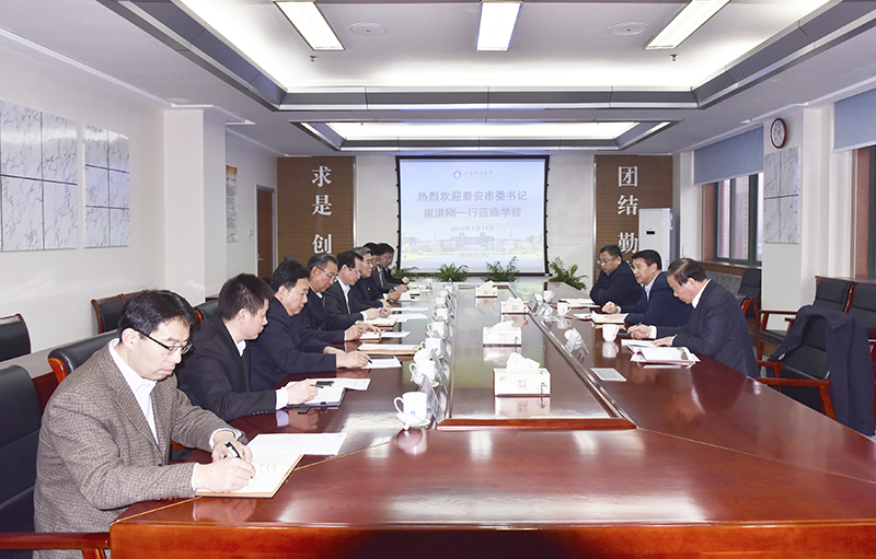 1月17日下午,泰安市委书记崔洪刚,市委常委、秘书长宋洪银,市委常委、组织部部长高尚山等一行5人来开云手机官方版在线入口调研。校党委书记罗公利,校长姚庆国,党委副书记王少鹏会见了崔洪刚一行。