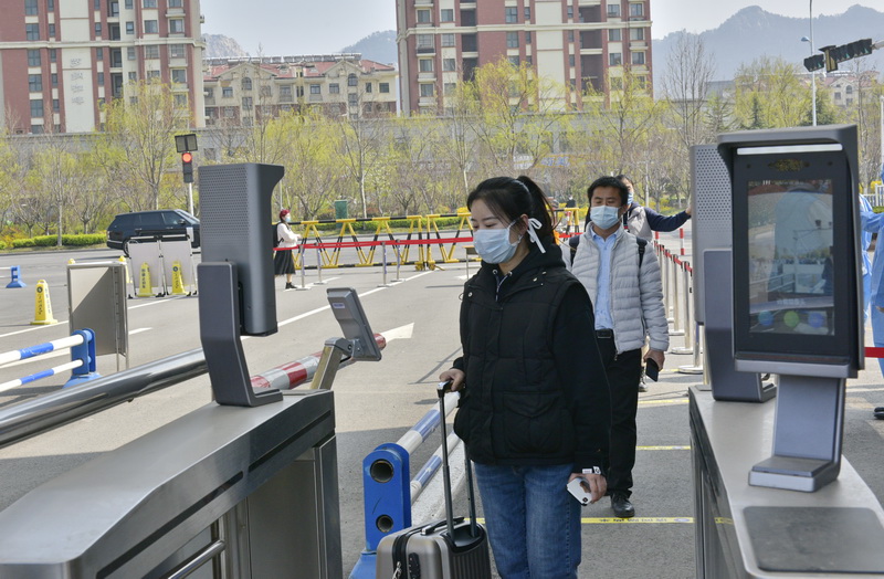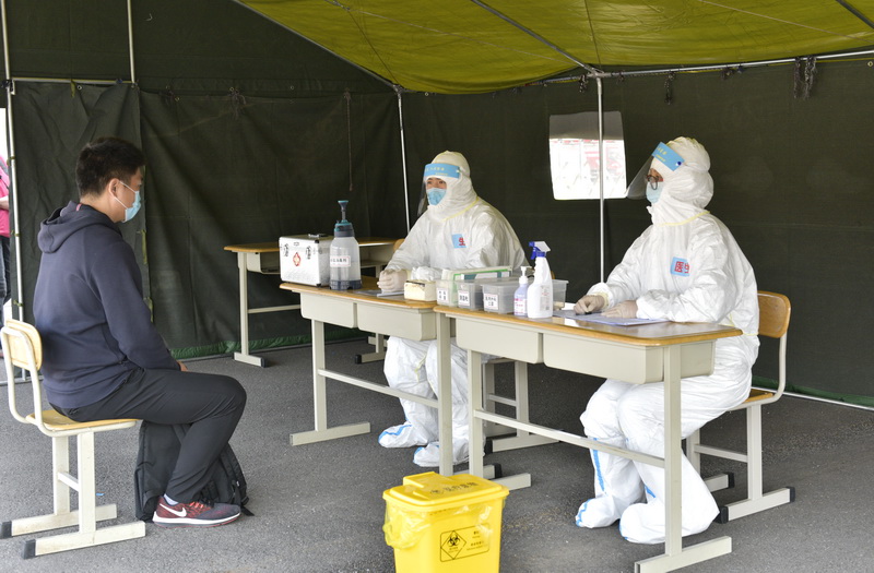 在学生返校进入校园的检测查验演练场景中,安全管理组工作人员设置回形隔离等待通道和醒目标识,提醒学生佩戴口罩、相互间隔1米以上;学生管理组工作人员指导学生在排队时抽取酒精消毒湿巾对随身行李等自行擦拭消毒;健康检测组工作人员查验学生电子健康通行码,进行体温检测,体温正常、核验成功人员,进入校园。