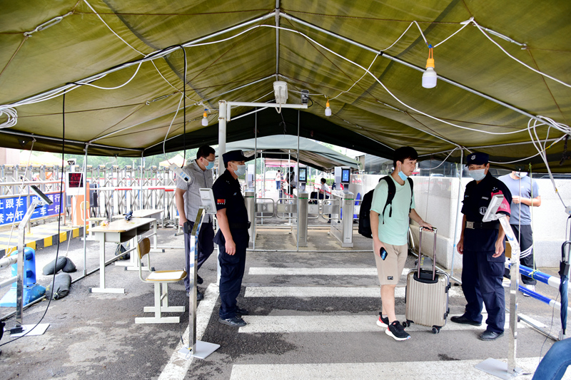 8月26日早上7点,青岛校区学校南门负责引导学生返校的学生志愿者、学工干部等工作人员已经到位。行李消毒、核验健康码、红外线测体温、人脸识别……按照事先安排好的流程,每个检验环节有条不紊,返校学生有序报到。