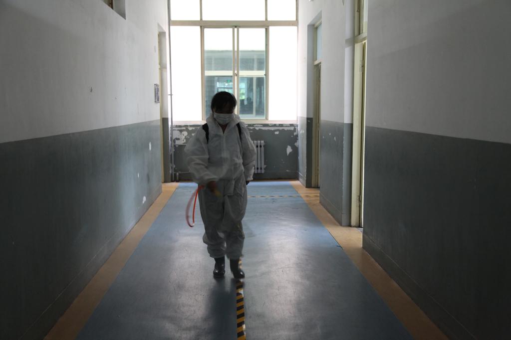 物业人员对教学楼进行消杀