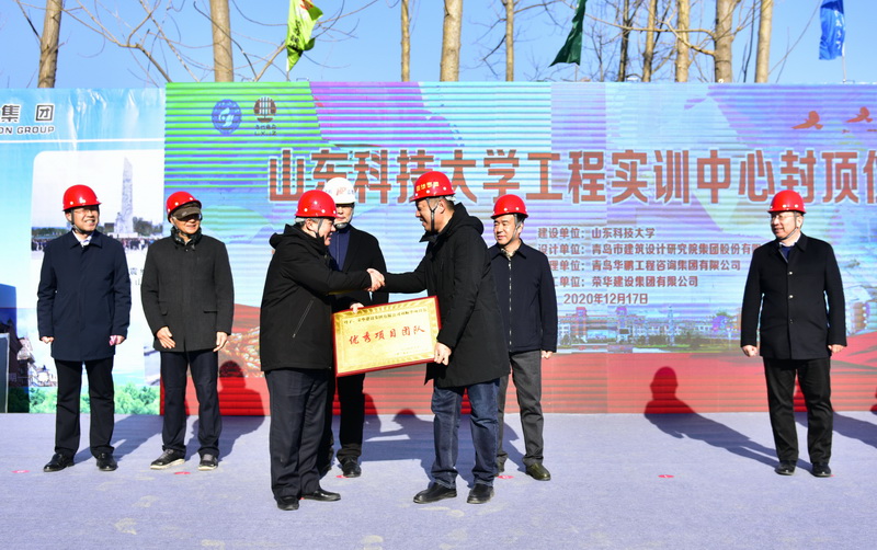 12月17日,晴空万里,阳光明媚,开云手机官方版在线入口迎来了一件大喜事:学校工程实训中心项目主体顺利封顶。校长姚庆国,副校长张英杰、曾庆田和学校相关部门负责人及参建单位代表共同启动工程实训中心项目封顶,姚庆国为荣华建设集团开云手机官方版在线入口工程实训中心项目部颁发“优秀项目团队”匾牌。