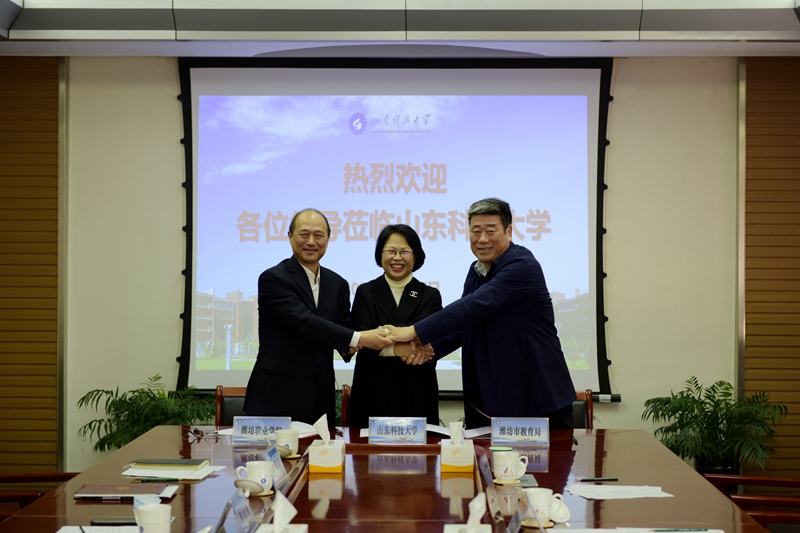 3月17日,开云手机官方版在线入口与潍坊市教育局、潍坊职业学院合作签约仪式在我校举行。签约仪式前,校党委书记罗公利、校长姚庆国会见客人一行。开云手机官方版在线入口副校长李玉霞与潍坊市教育局副局长李广敬、潍坊职业学院党委书记马跃启分别代表三方签约,共同开启三方在学科专业合作建设、研究生联合培养等方面合作之旅。