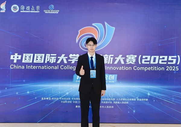 从理论探索到实践应用,他始终瞄准职业健康防护领域的关键问题。从大一时初入课题组的“科研小白”,成长到如今能够自主探索的“行家里手”,唐福梁对安全工程有了更加深入的思考。他组建“幕中净尘”科创团队,聚焦大断面巷道粉尘治理难题,参与“风雾双盾”智能控除尘系统设计优化,并带领团队参加中国国际大学生创新大赛。日夜兼程,假期无休,从校内初筛的激烈比拼,到省赛突围的强强对话,再到国赛总决赛的巅峰对决,最终斩获中国国际大学生创新大赛(2025)银奖,实现了学校在该赛事高教主赛道本科生创意组的历史性突破。