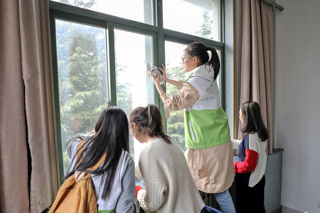 志愿者分工明确,有纱网窗清理组、空调过滤网拆卸组、玻璃清洁组,把一扇扇沾染灰尘的纱窗、一个个极易被忽略的空调过滤网等这些时刻与老师们“共处”的物件清理得干干净净,为老师们营造了更加舒心明亮的办公环境。
