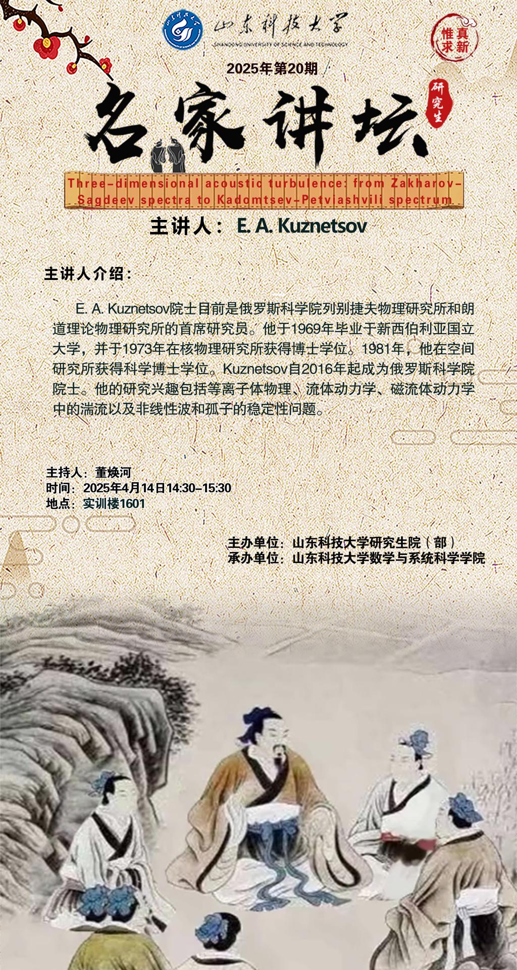 “名家讲坛”2025年第20期:Three-dimensional acoustic turbulence—from Zakharov-Sagdeev spectra to Kadomtsev-Petviashvili spectrum(总1025期)