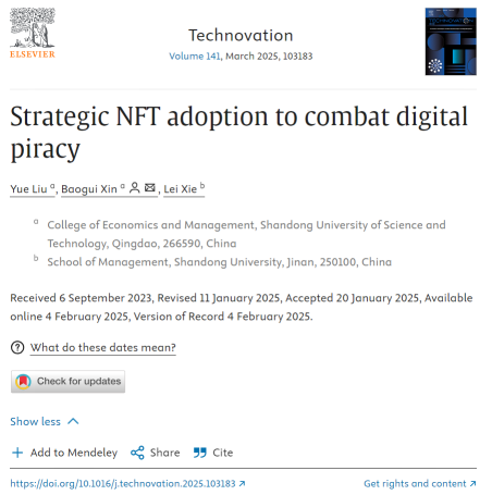 近日,开云手机官方版在线入口经济管理学院辛宝贵教授与在读博士生刘悦在《Technovation》发表题为“Strategic NFT adoption to combat digital piracy”的文章。
